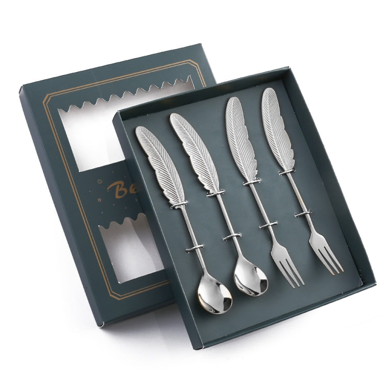 304 Stainless Steel Feather Spoon Fork Literary Tableware,Style: 4 In 1 True Color -Green Box