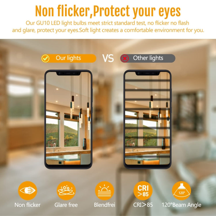 3. Easy to Install: GU10 base, these led bulbs fit well into any standard GU10 recessed lighting fixtures. Just plug and play. Mercury free and no UR/IR radiation, safe for family use.