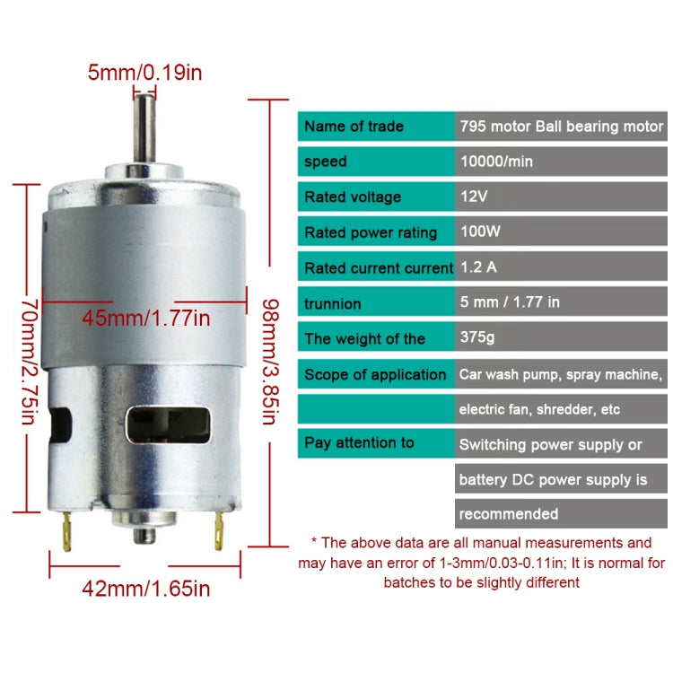 6. 795 is a high-speed double bearing with a rated voltage of 12V and a speed of 10000/min. Approximate size: diameter 45MM, length 70MM, total length 98MM, shaft diameter 5MM, weight 375 grams.