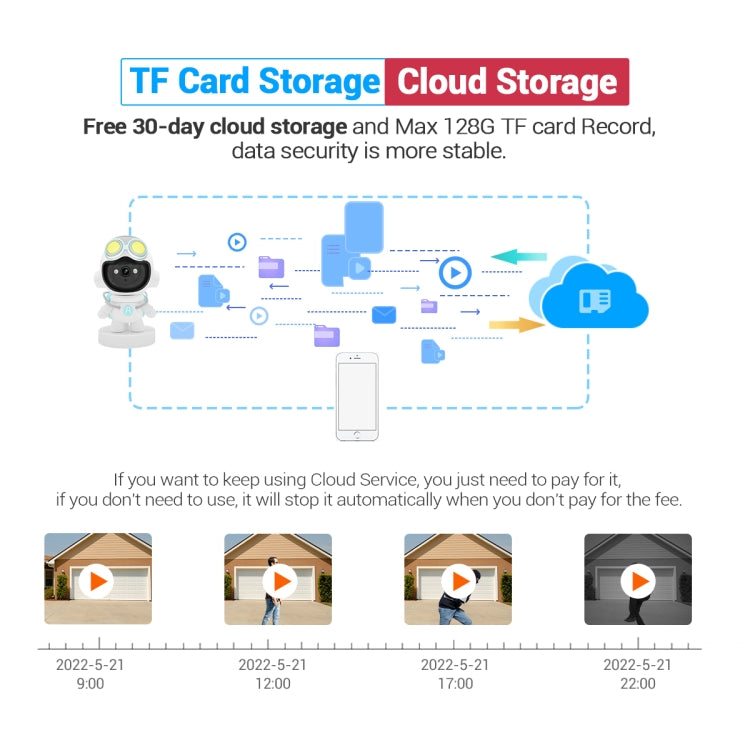 7. Support cloud storage, up to 128G memory card, support audio recording and alarm recording
