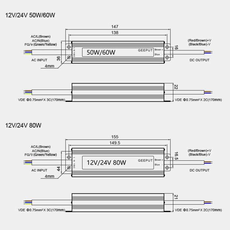 10. Wiring mode: AC input wire (brown L live wire, blue N neutral wire, yellow and green two-color ground wire), DC output wire (brown/red +V positive pole, blue/black -V negative pole)
