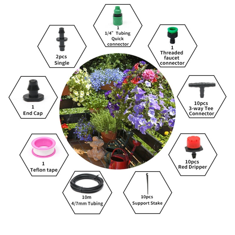 -10m kit: 4/7mm tube x 10m, quick connector x 1, 46-point nipple x 1, eight-hole dripper x 10, 3-way tee x 10, fixing bracket x 10, teflon tape x 1 pc, straight x 2 pcs, end cap x 1