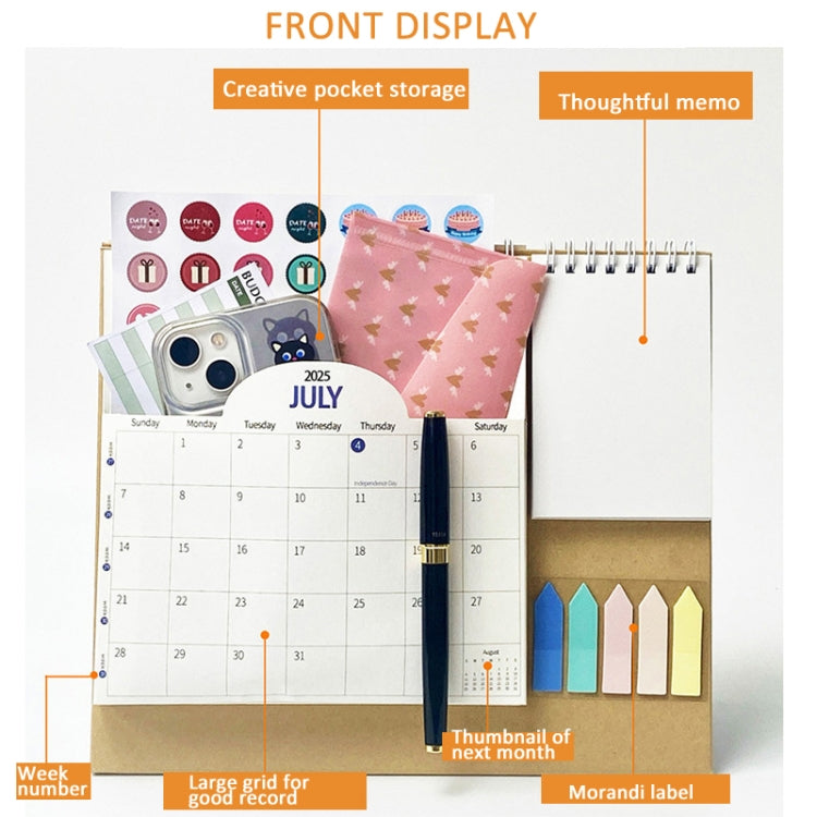 1. 2025 desktop calendar, with a calendar pocket on the front to store items, 5-color labels and portable memos for recording important matters; the back also has a monthly planning area/daily check-in area/monthly key area division to better plan your schedule