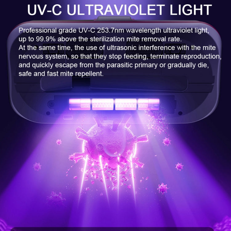 2. 253.7nm wavelength ultraviolet light, up to 99.9% of the sterilization rate of mites. At the same time, the ultrasonic wave interferes with the mites nervous system to make it stop feeding and terminate reproduction, which is safe and fast to drive away mites.